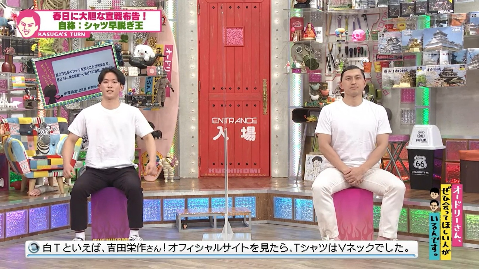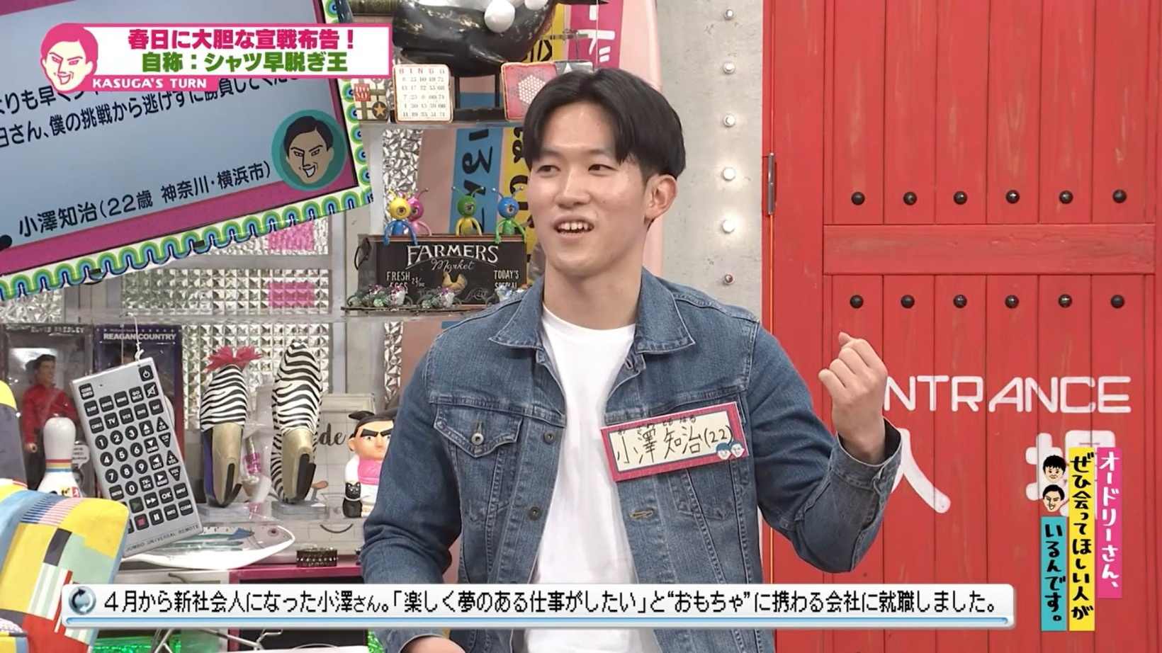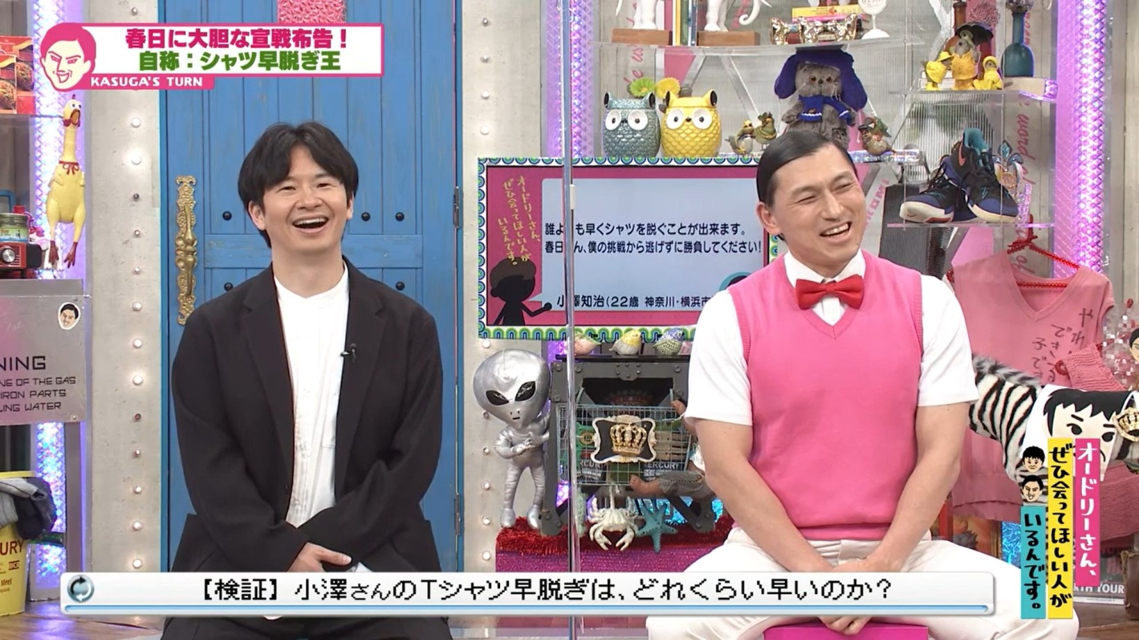 2022年6月27日の放送分では、「誰よりも早くシャツを脱げる男」と自称する小澤知治さんが出演。春日と1対1でシャツ早脱ぎ対決をする。熱い宣誓バトルから始まった対決は、最後にはビデオ判定に持ち込まれる。