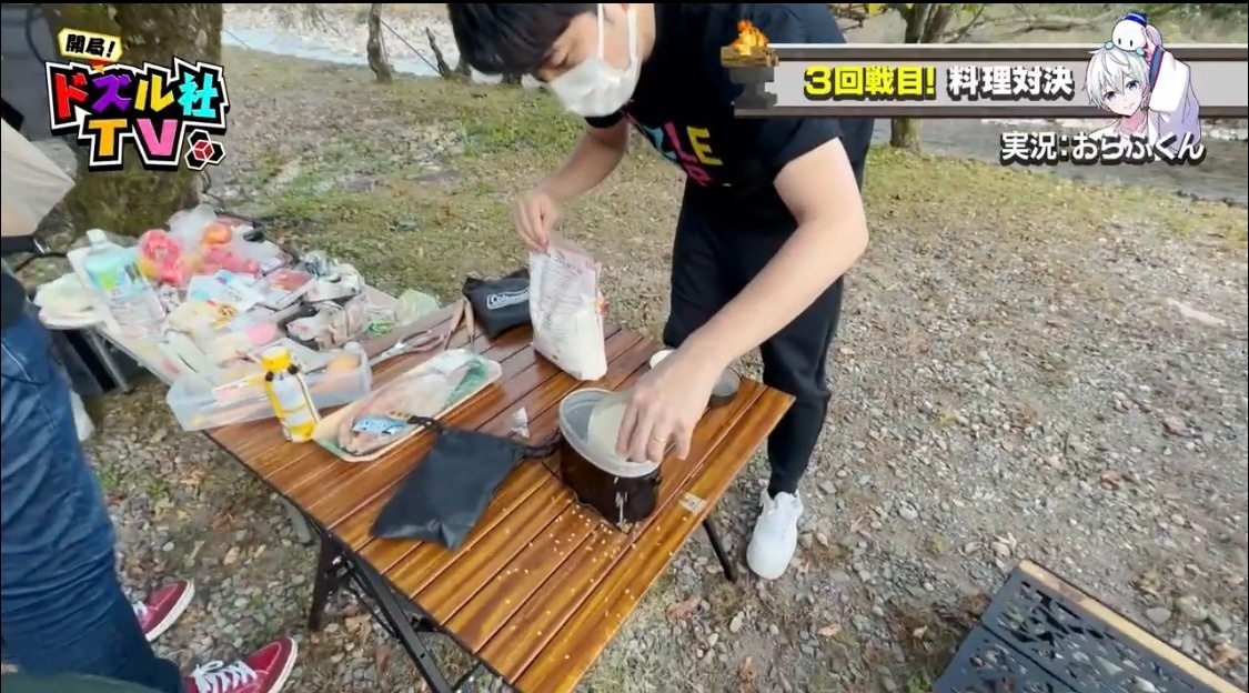 「結局米説がある」と話すドズルは、飯ごうを使って米を炊くと宣言。ただ、「めちゃくちゃ不器用なんですよ、実は」と少々の不安を滲ませます。慎重に作業を進めるのですが、不安は的中し米をこぼしてしまう一場面がありました。