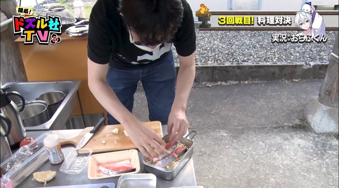 ドズル&カズチーム、ぼんじゅうる&タツナミチームに分かれ、「テント組み立て対決」「10分間早釣り対決」に続いて最終勝負に突入。テーブルにずらりと並んだ食材で行う「料理対決」です。