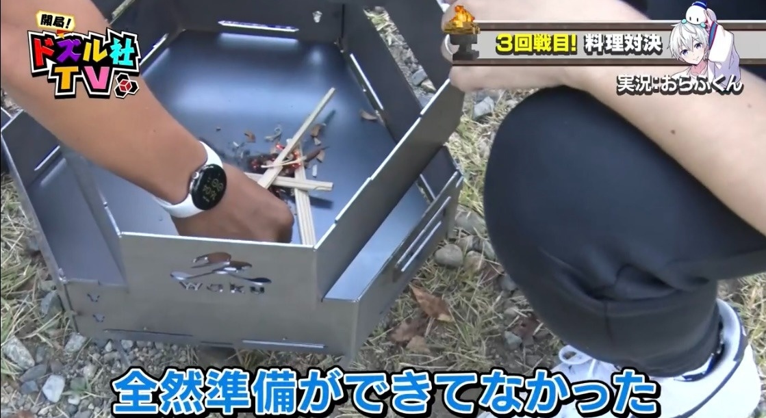 一方、タツナミさんは「火をつけるためには準備しないと」と事前準備を怠りません。タツナミさんへ注目が集まっている隙に、カズさんはバーナーで一気に火をつけてしまいます。偵察にやってきたぼんじゅうるに対し、「火打ち石打ったら、ぶおぉぉぉって(火がついた)」と誤魔化すドズルですが、「なるわけない!」とツッコまれます。