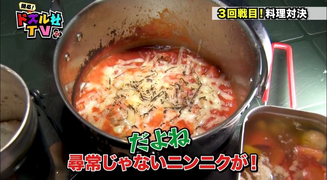 まずはドズル&カズチームから。“悪魔仕立て”だというトマトチーズ風チキンソテーを食べた番組プロデューサーは「普通ではないぞ、なんだコレ?」と驚いた様子。その秘密は、尋常じゃない量のニンニクが入っているということでした。