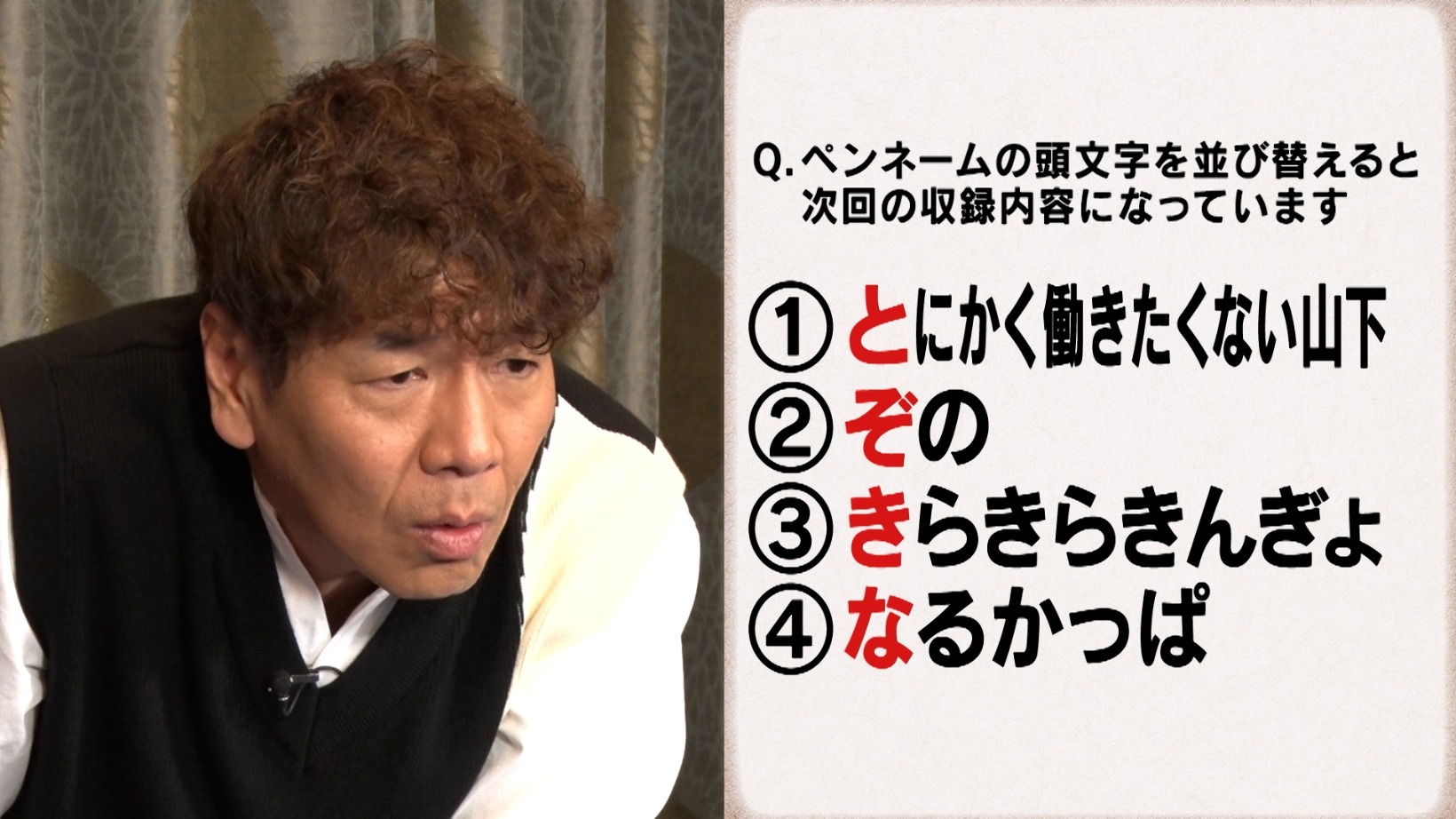 ここで、今回お便りが読まれた視聴者のペンネームの頭文字をつなげると、次回の収録内容がわかるという仕組みが隠されていたことがスタッフより明かされる。