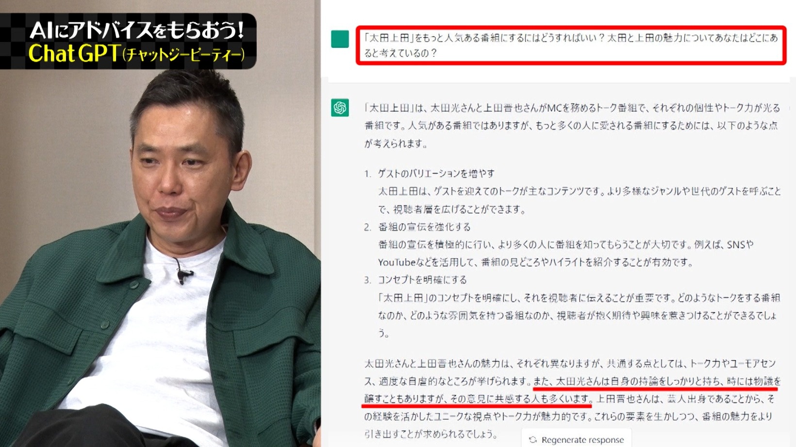 ここで浜ロンが登場し、さっそく「太田上田をもっと人気のある番組にするにはどうしたらいい?」とAIに訊ねると、「ゲストのバリエーションを増やす」「番組の宣伝を強化する」「コンセプトを明確にする」という答えが返ってきた。