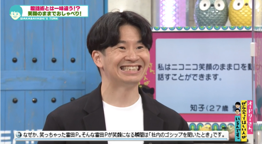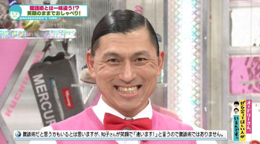 若林は「今、そこじゃないんだよ」と冷静なツッコミを入れて、知子さんに「腹話術とかで口を閉めるっていうのは見たことあるけど、笑顔のままっていうのは初めて見ました。やり方のコツとかありますか?」と尋ねる。
