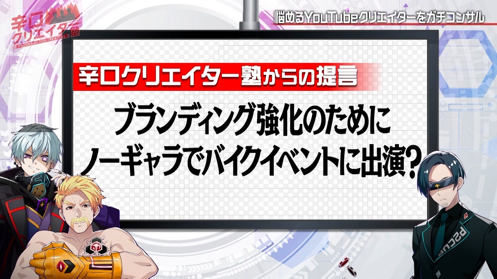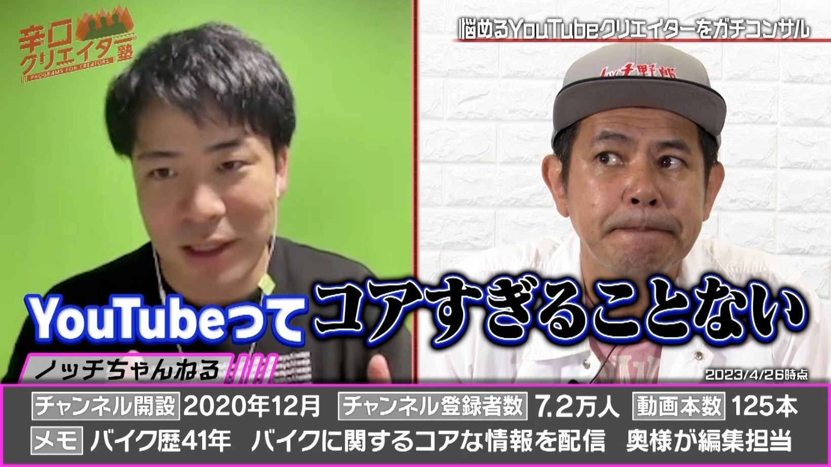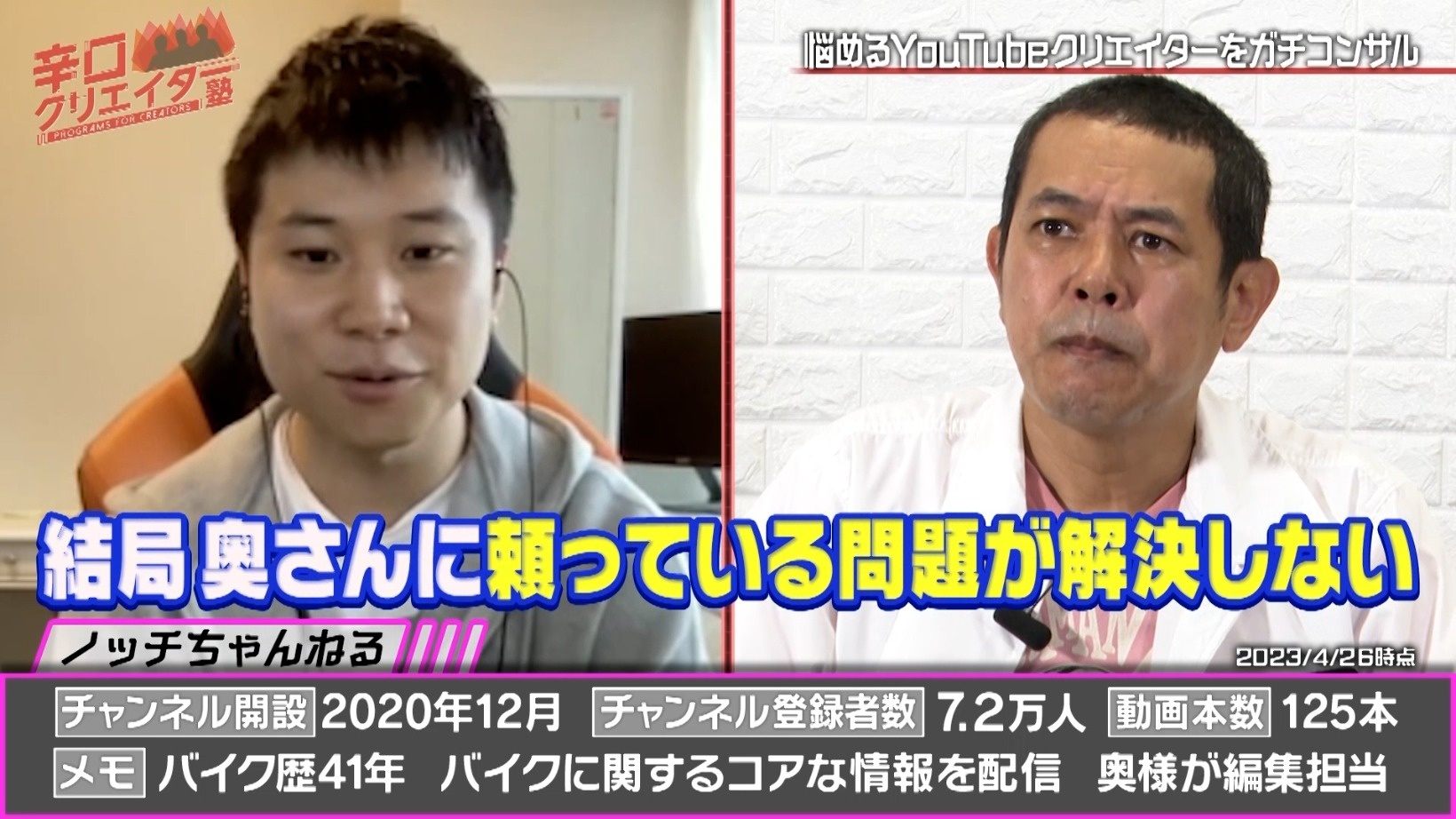 悩めるYouTubeクリエイターを相手に、ネットメディア界のプロ集団がガチコンサルする『辛口クリエイター塾』。超人気ゲーム実況者、YouTubeアナリスト、YouTubeプロデューサーといった専門家ぞろいのレギュラー講師陣が、相談者のチャンネルV字回復に向けて辛口アドバイスをしていきます。