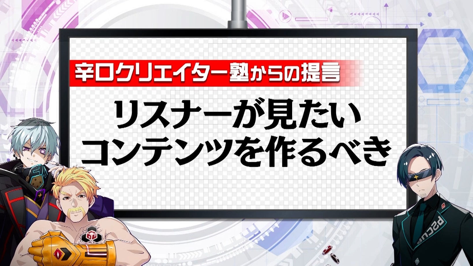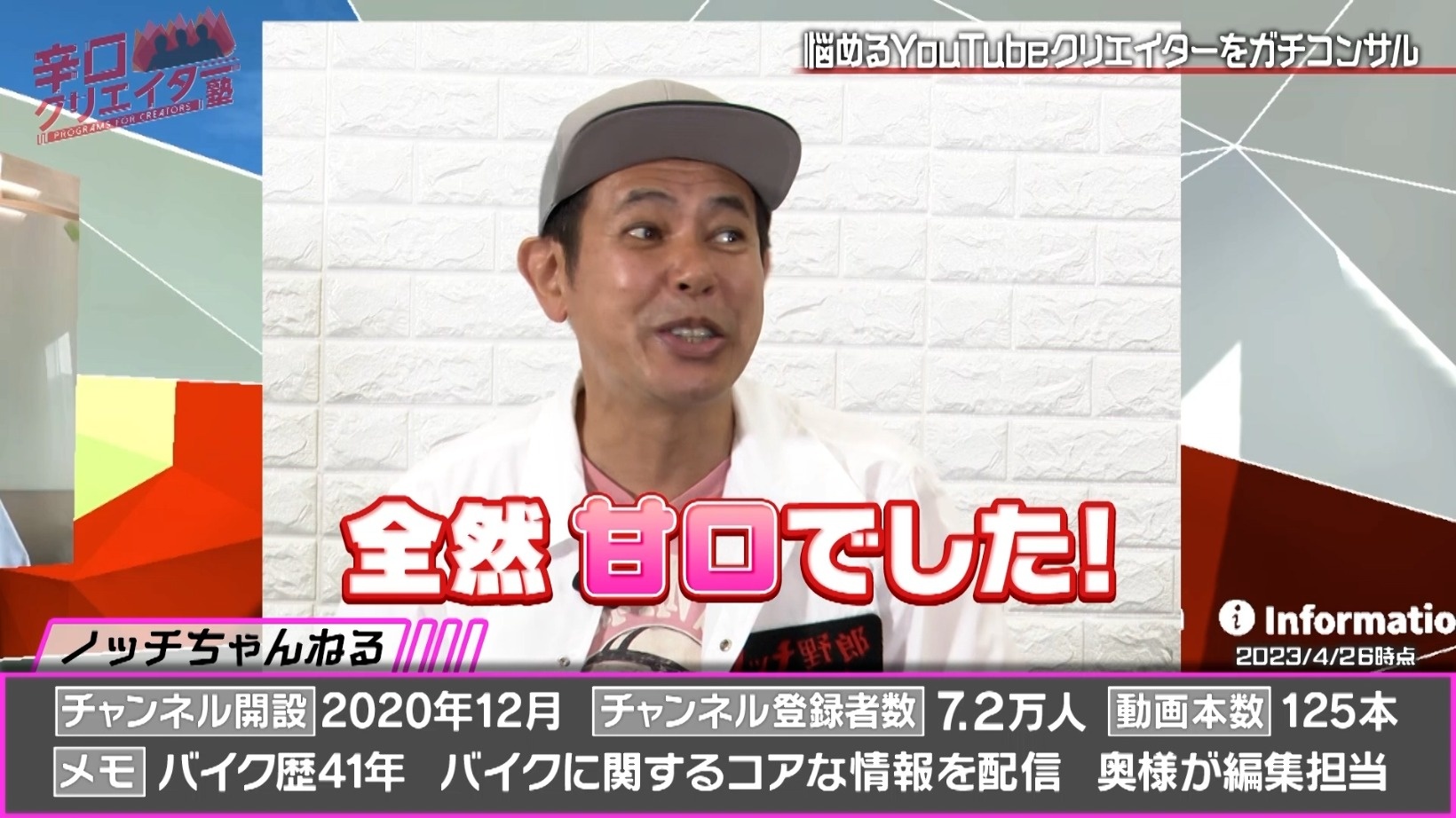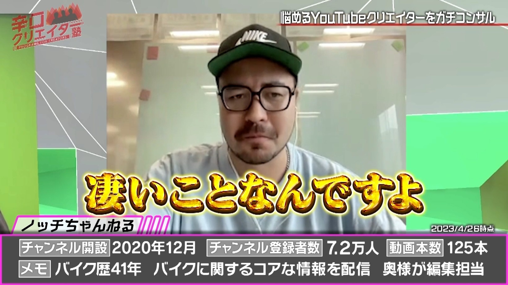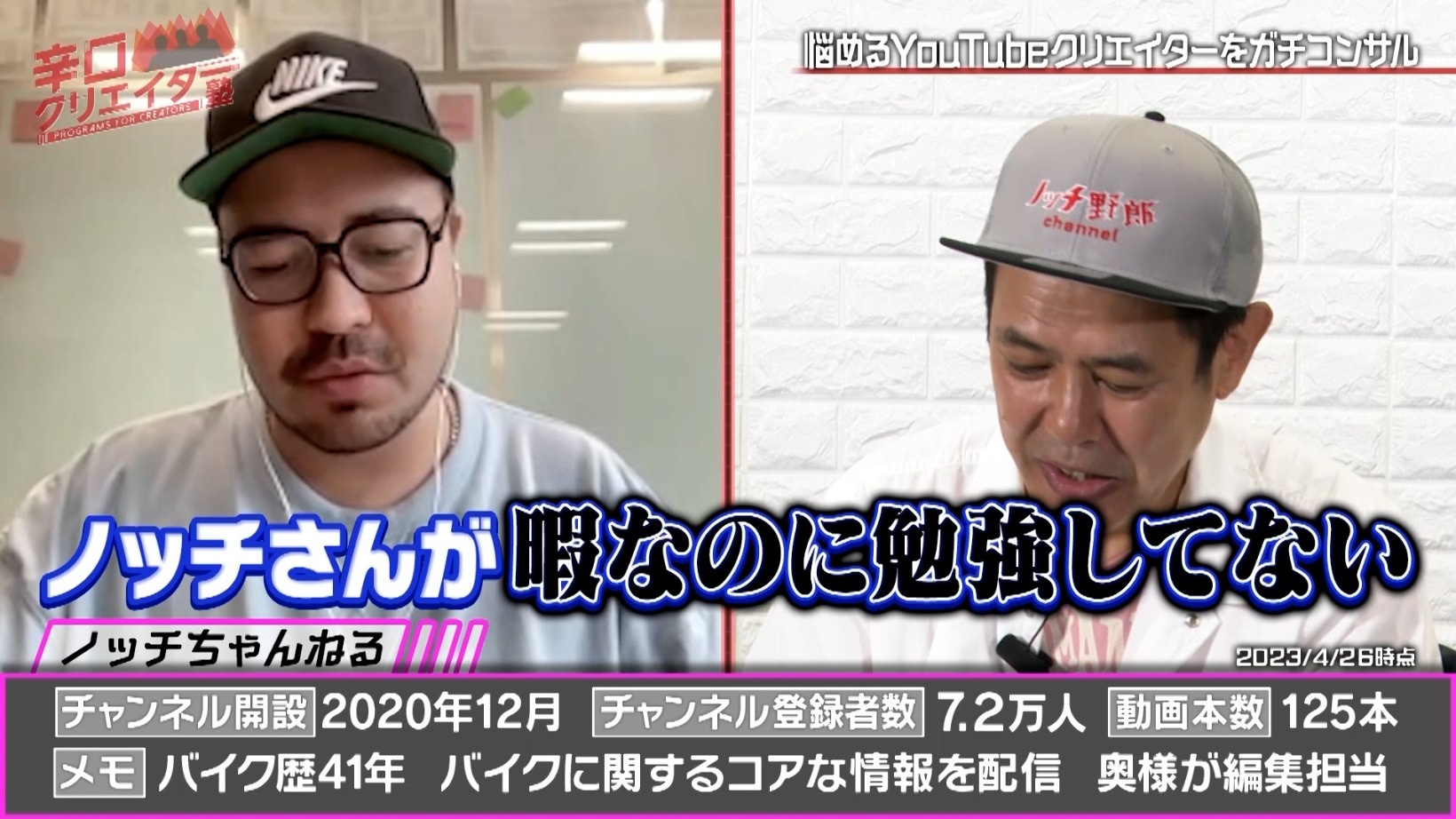 悩めるYouTubeクリエイターを相手に、ネットメディア界のプロ集団がガチコンサルする『辛口クリエイター塾』。超人気ゲーム実況者、YouTubeアナリスト、YouTubeプロデューサーといった専門家ぞろいのレギュラー講師陣が、相談者のチャンネルV字回復に向けて辛口アドバイスをしていきます。