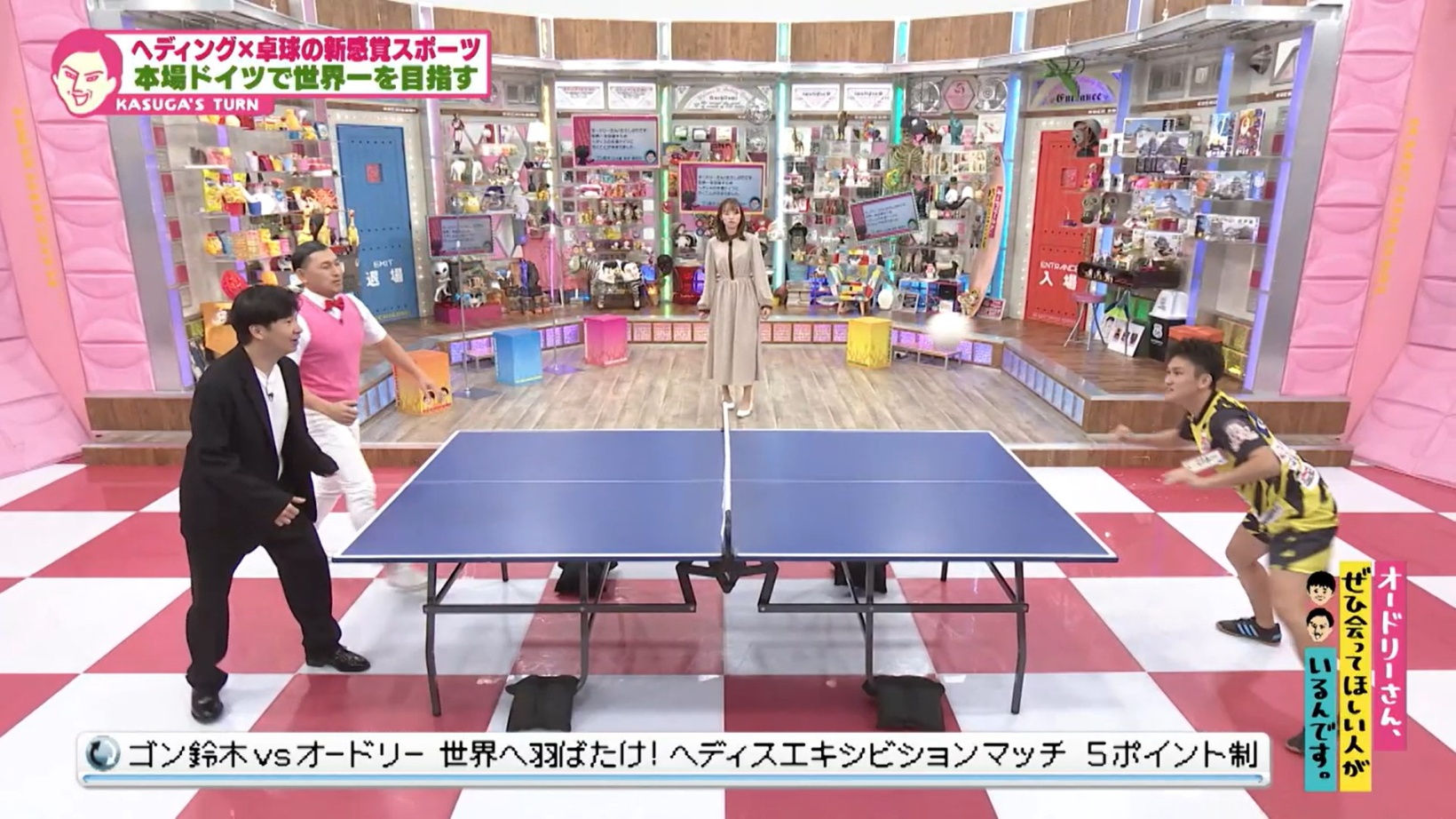 スタジオに卓球台が登場。オードリーvsゴン鈴木さんでへディス対決をする。勝負前に「ここで負けたら、ドイツ行くのやめなさいね」と春日が煽ると、ゴン鈴木さんは「パスポート破ります」と気合い十分の様子。