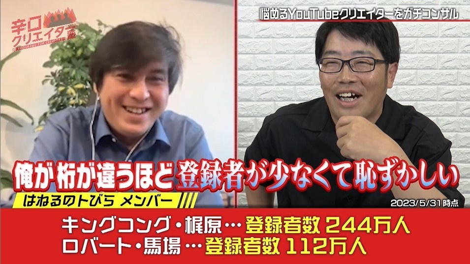 『はねトび』で共演していたキングコングの梶原雄太やロバートの馬場裕之が、自分よりもはるかに多い登録者数を抱えていることに劣等感を感じている様子。現在の登録者数は、「一般人が誇れる」くらいの数だと話します。