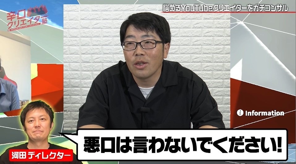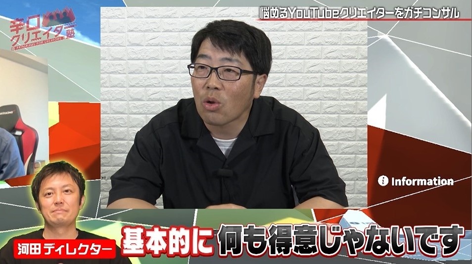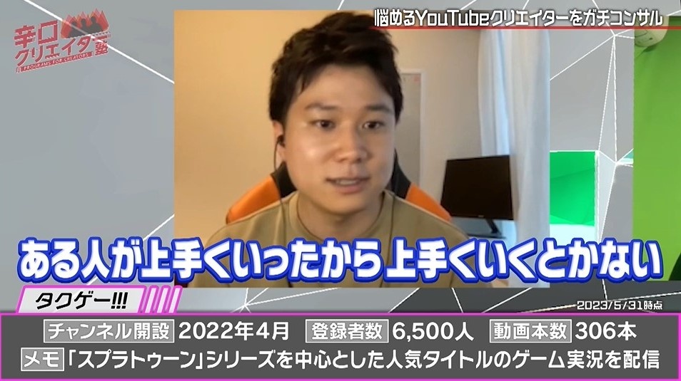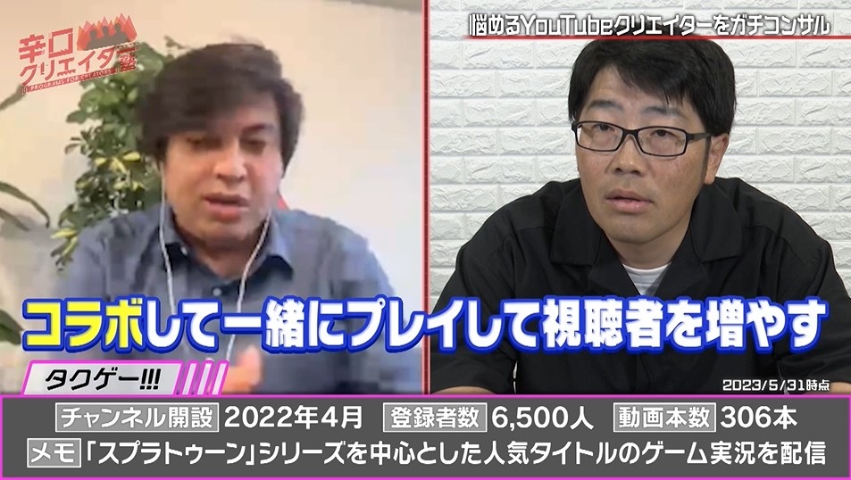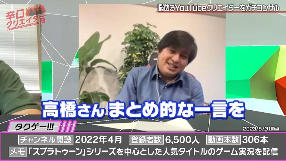 悩めるYouTubeクリエイターを相手に、プロ集団がガチコンサルする『辛口クリエイター塾』。超人気ゲーム実況者、YouTubeアナリスト、YouTubeプロデューサーといった専門家ぞろいのレギュラー講師陣のほか、元テレビ東京の高橋弘樹がゲスト講師として集まり、相談者のチャンネルV字回復に向けて辛口アドバイスをしていきます。