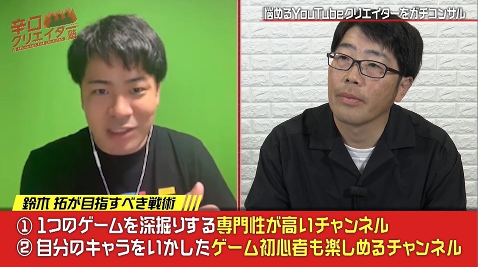 第13回目の相談者は、お笑いコンビ・ドランクドラゴンの鈴木拓。世間の知名度は高いにもかかわらず、YouTubeのチャンネル登録者は少ないという悩みがあるようです。YouTubeに数多あるゲーム実況チャンネルのなかで数字を伸ばすには、鈴木のキャラを生かすことが大切だとアドバイスする講師陣。チャンネルの方向性は一体どうなるのか…!?