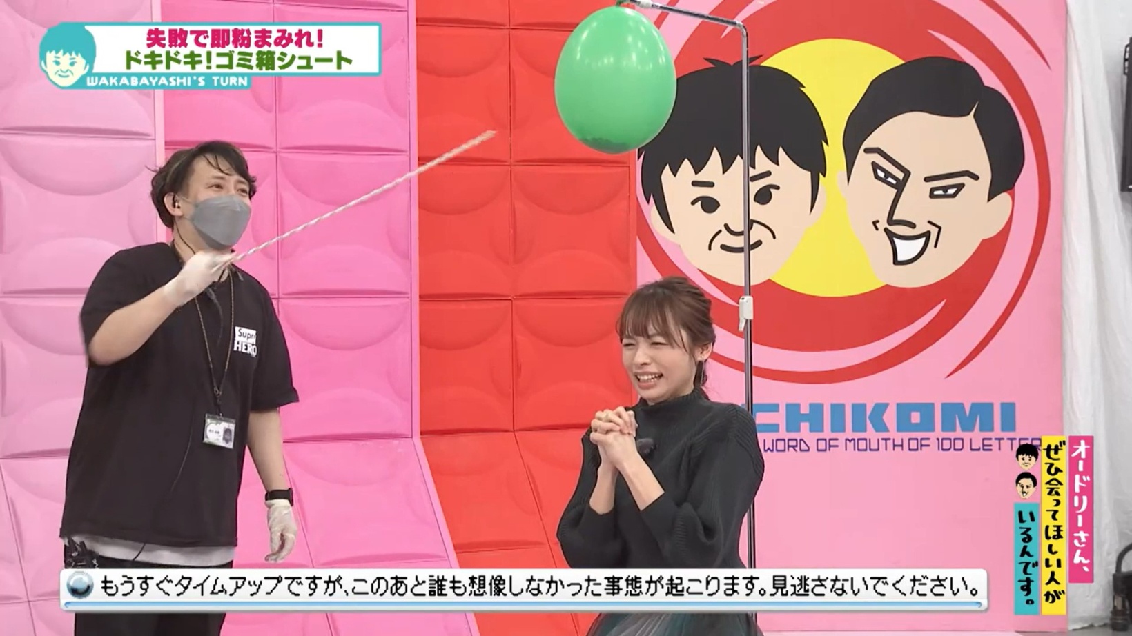 ミッションの内容は、「ゴミ箱シュート」の3連続成功チャレンジ。若林、春日、清水さんが3人連続でゴミ箱にゴミをシュートできれば成功となる。制限時間は2分間で、失敗すると阿部アナが上から粉をかぶるというペナルティが待っているそう。