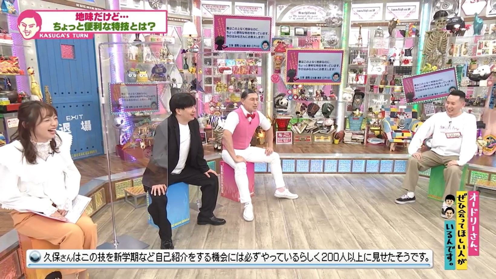 「地味だけど便利な特技」をもつという、24歳の久保遼馬さん。「社会人2年目で、次が3年目になります」と自己紹介し、春日からすかさず「そうだろうね」とツッコミが入る。
