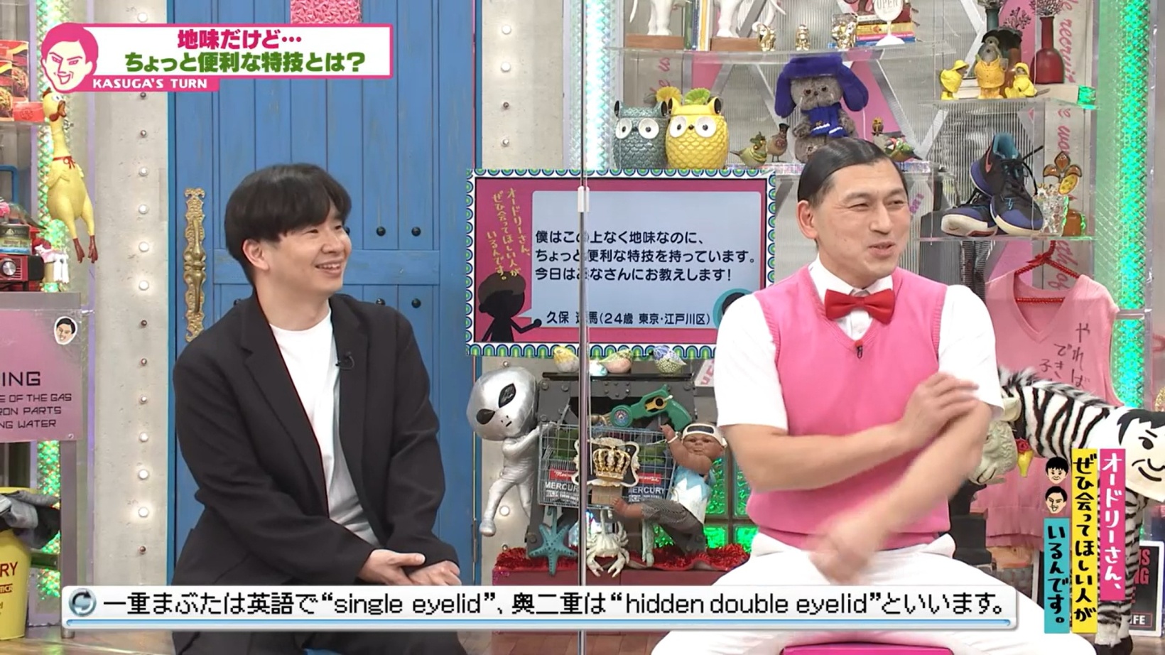 説明後、久保さんは一重まぶたを披露。オードリーの反応は「あ~」と微妙で、スタジオには笑いが起こる。続いて、ぱっちり二重を披露すると「なってる…ね」「一重よりは(変身した)」とオードリーが評価し、頷く久保さん。
