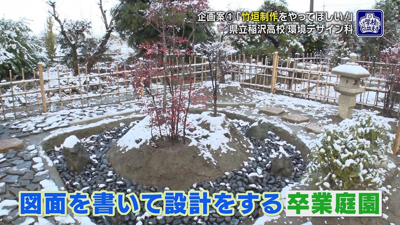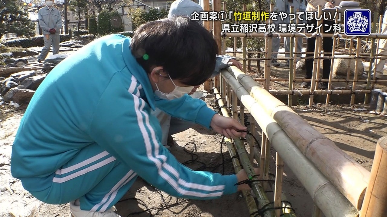 まずは造園コースで、庭造りのお手伝いから。3年生たちが図面を書いて設計し、35平米の土地に庭を造る卒業庭園の実習中。向井さんは代表的な竹垣「金閣寺垣」に挑戦です。