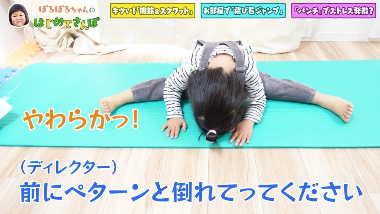 すると、ぽるぽるちゃん見事な開脚前屈!