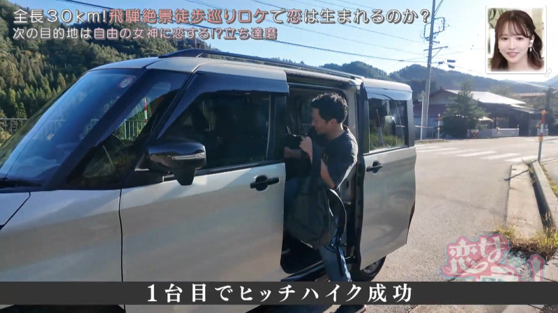 徒歩で進むロケですが、途中でお助けミッション「10kmのヒッチハイクを使うこと」をてるが提案。最初に声をかけた車の運転手は、番組の視聴者で、そのまま乗せてもらえる幸運に恵まれました。