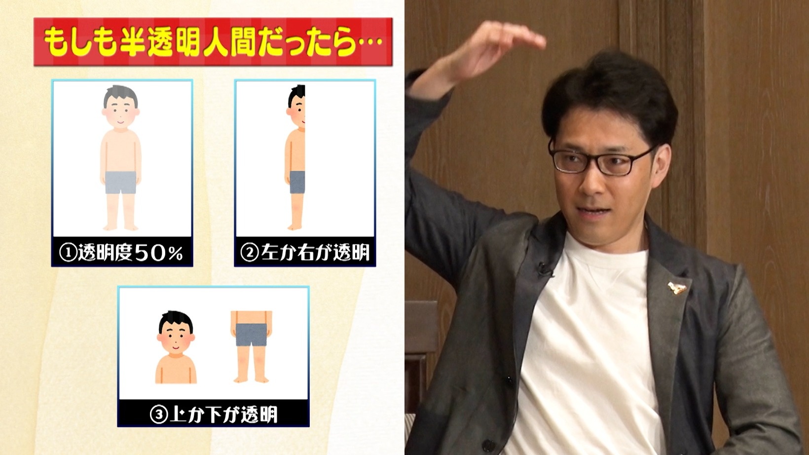 自分が半透明になれるとして、透明度50%で薄っすら透けている、体の左右どちらかが完全に透明になる、上半身か下半身どちらかが透明になれるという選択肢があるならどれを選ぶかと問いかける浜ロン。