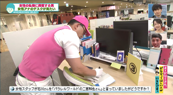 石川さんのお眼鏡にかなう女性アナのデスクを見つけるべく、アナウンス部に潜入した春日。誰のデスクかがわからないよう、それぞれに番号を振り、三番のデスクへ向かいます。