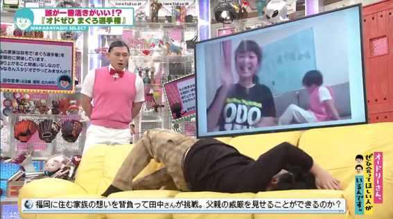 「田中さんの挑戦です!お願いします!」と若林が言うと、田中さんは頭上で手を合わせ、「スピンスプラッシュ!」と勢いよくソファーへダイブ。田中さんは、活きがいいマグロのように飛び跳ねます。