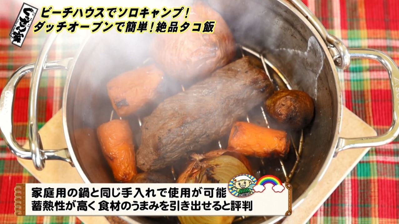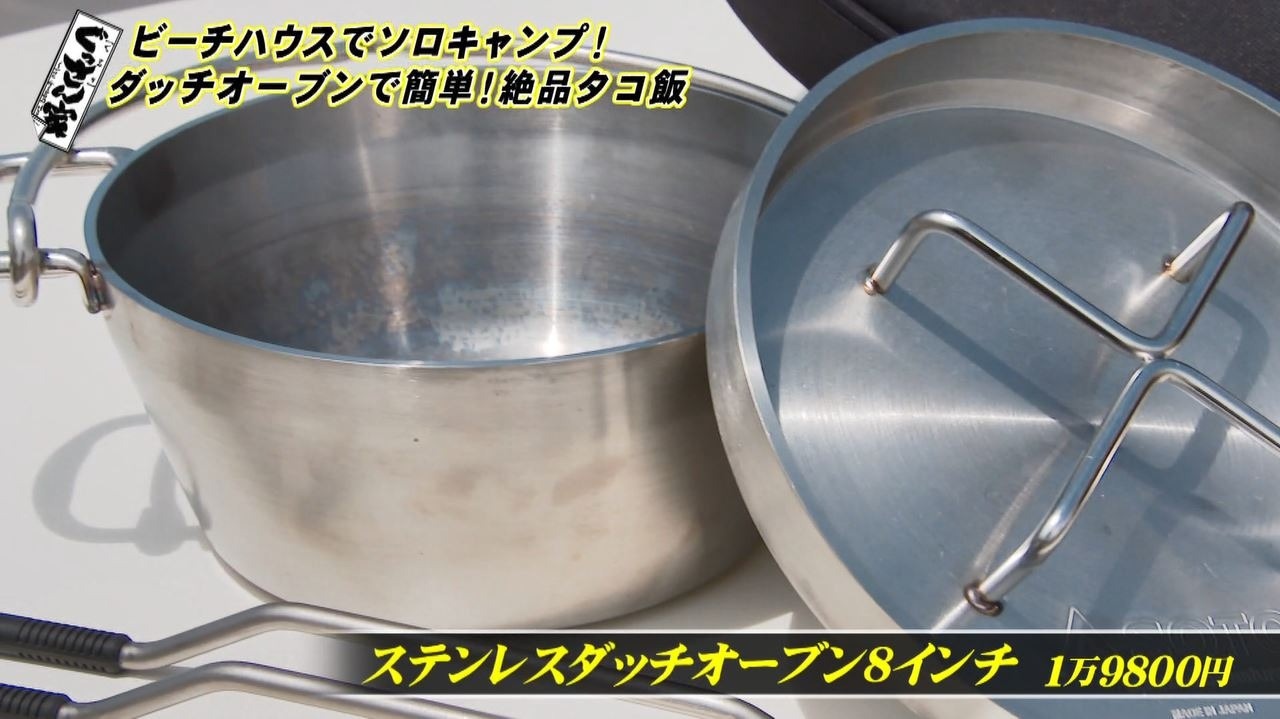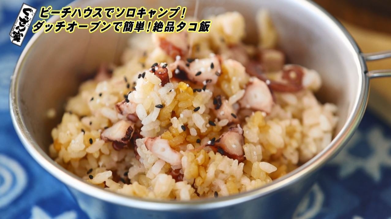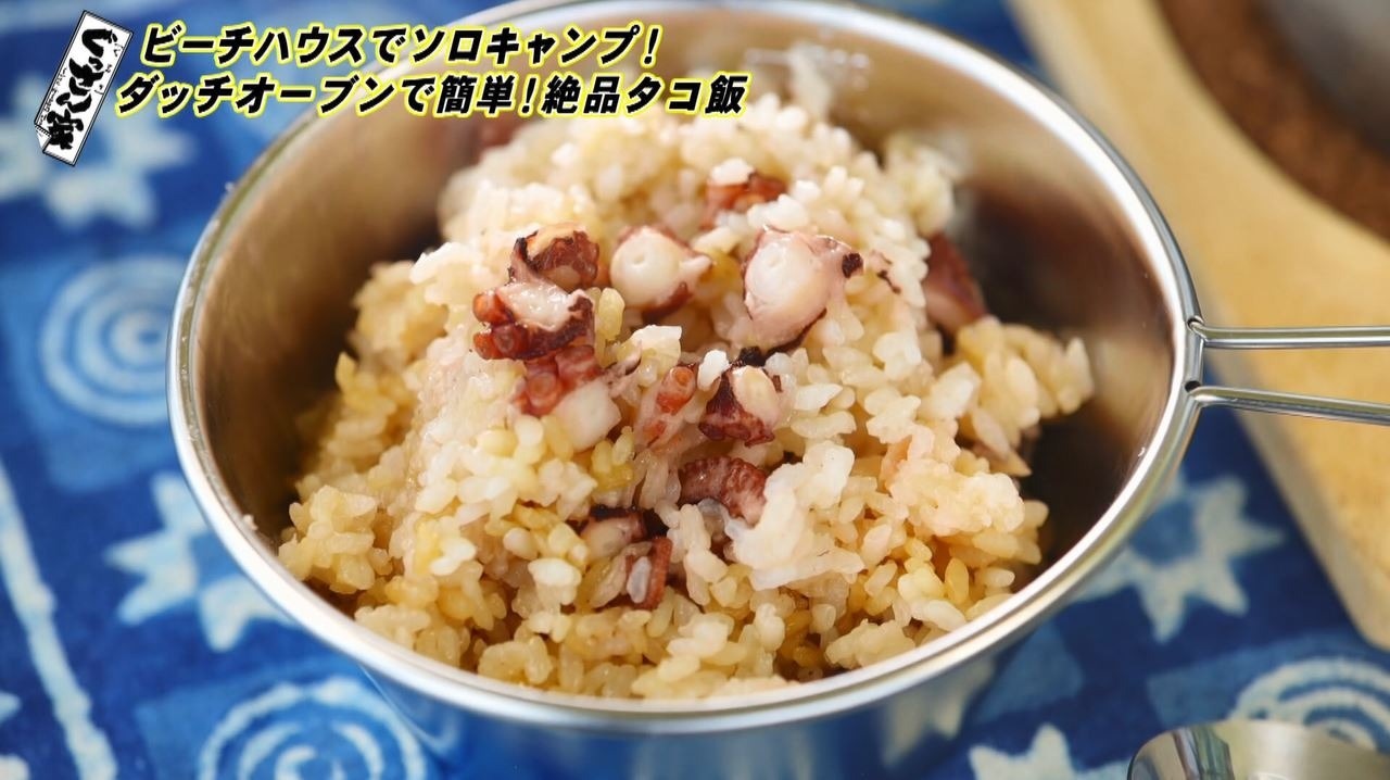 ベースができたら続いては料理!日間賀島の名物のタコを使って『タコ飯』を作ります。ここで登場したのがアウトドアで本格的な料理が作れると人気の万能鍋『ステンレスダッチオーブン』(8インチ・1万9800円)。分厚いステンレス製でフタの上に炭火を乗せることも可能。じっくり加熱することで食材のうまみを引き出します。
