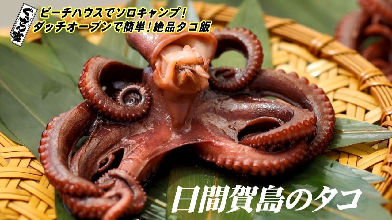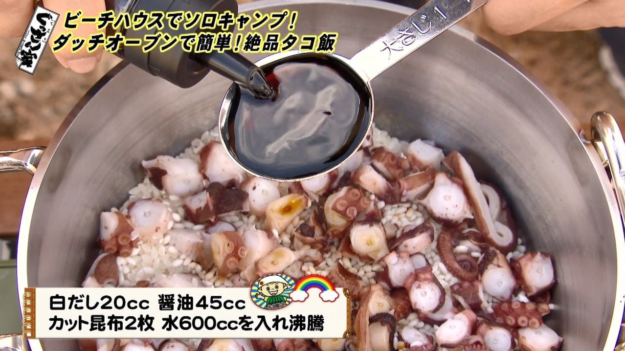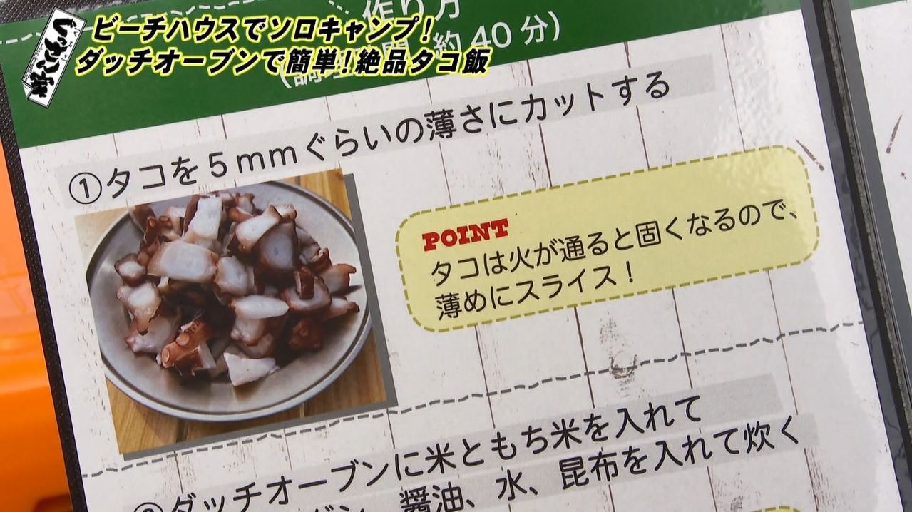 タコ飯に使うタコは、番組でいつもお世話になっている日間賀島の旅館『御やど 乙姫』から差し入れ!「乙姫さん、無事届きましたよ!」と感謝のぐっさん。スタッフ特製の『タコ飯レシピ』を見ながら、ひとりでアウトドア飯にチャンレジです。