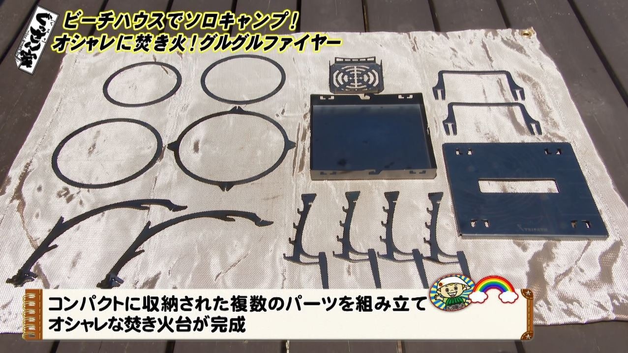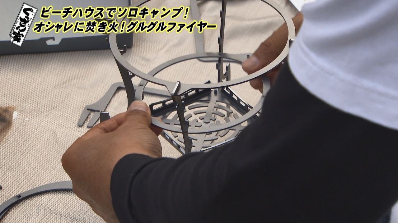 『GURU GURU FIRE』(XS・1万6280円)というアイテムで、手のひらサイズのボックスに複数のパーツが収納されています。「いいですね小さいやつ。焚き火台も欲しいねんな。まず収納がめっちゃコンパクトでしたね」と感心。「こういうこと?すごくない?」とパズルのようなパーツを組み立てて、おしゃれな焚き火台が完成!