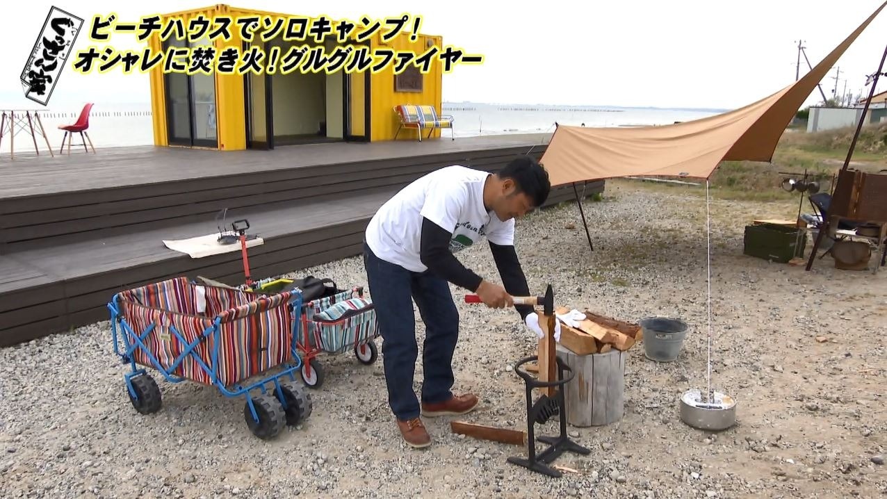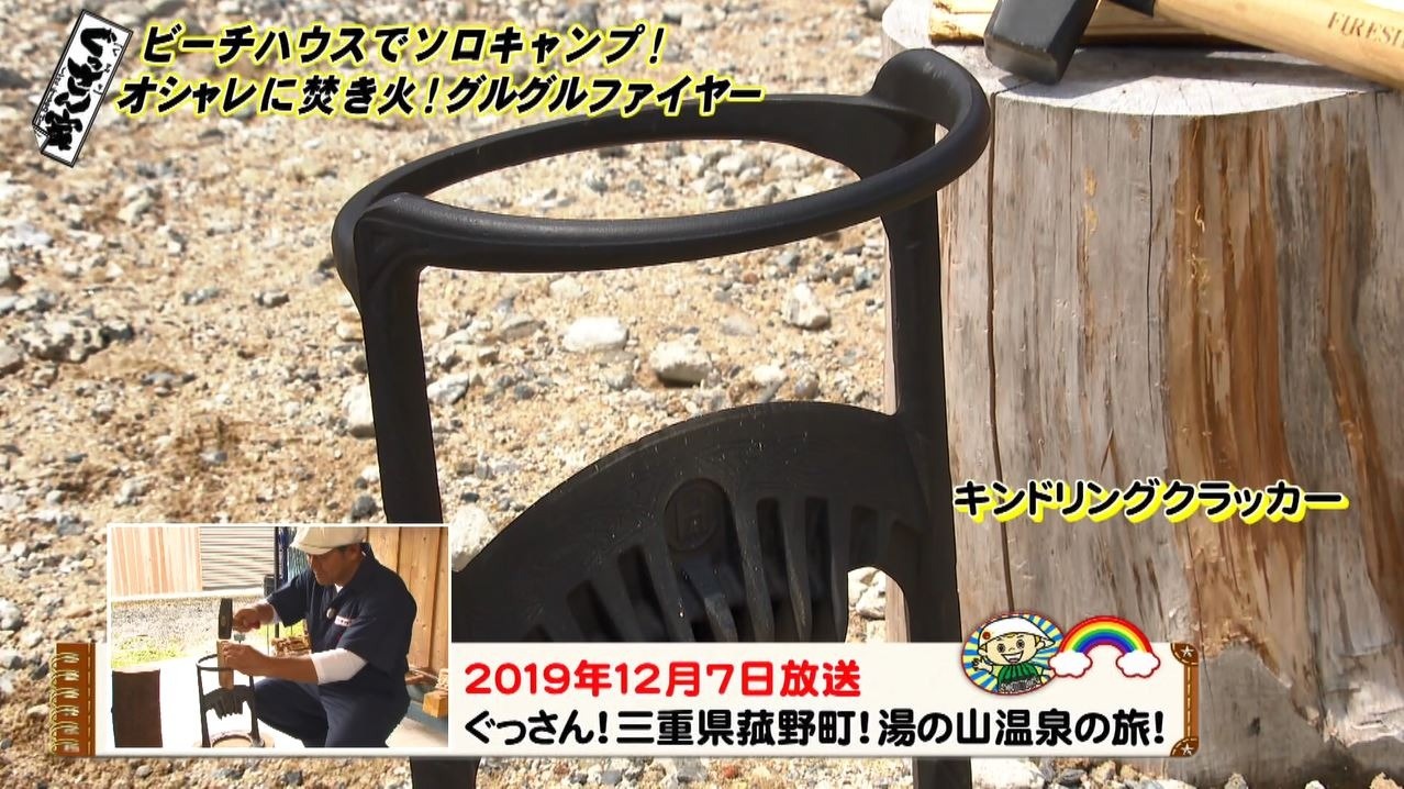 続いて焚き火に使う薪を割るアイテムが登場!以前番組で出会った三重・菰野町の『薪ストーブ専門店チムニー』でいただいた『キンドリングクラッカー』。リングの部分に薪を入れハンマーで叩くだけで簡単に薪割りができます。初心者のぐっさんも楽々!「イエーイ!いいですね。これめっちゃ楽やん」と驚きです。