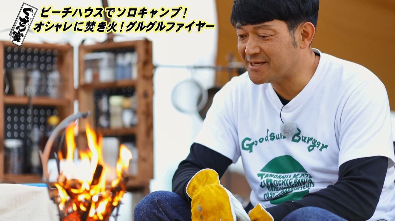 そして焚き火台に薪を入れて点火。スタッフから「次に『ぐっさん家』で一緒にキャンプをするなら?」と聞かれ「もう一度ゆっくりジョン・カビラさんは来ていただきたいな。ジョンさんも、慈英さんも『ぐっさんは川平兄弟の1人だから』と言われてるんで。僕なんか川平兄弟に入れてもらっているみたいです。フィーリングが一緒みたいで。アウトドア飯をガッツリかっくらいながら男の話したいですね」と笑顔のぐっさん。ユラユラした炎を見つめながら、ゆったりした時間を満喫します。