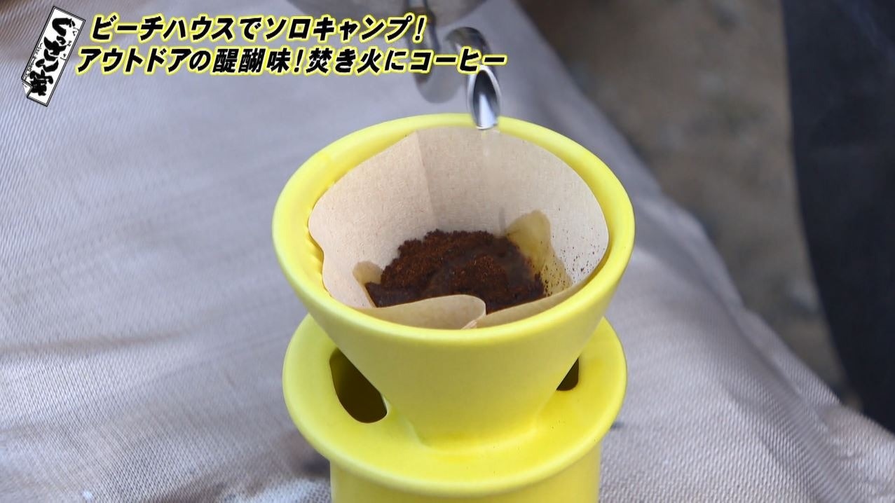 ドリッパーをセットしコーヒーポットで少しずつお湯を注ぎ、豆を蒸らしながら淹れていきます。「わー、いい香りやね。この蒸らしの匂いと薪の匂い、これがダブルできて、すっごくいい」と大人のコーヒーブレイクを堪能…まさに大人の時間です。