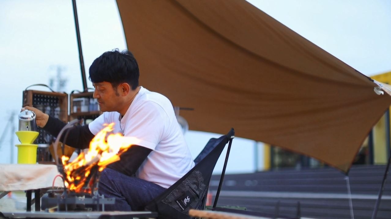 最後はコーヒータイム。「いま最高にコーヒー飲みたい時です!」と焚き火台にケトルをセットし、コーヒー豆も丁寧にミルで引きます。