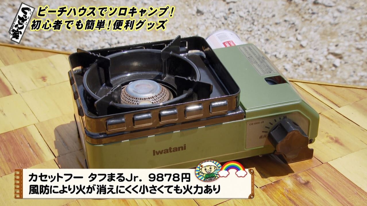 「でも僕が目指すぐっさんの中には“キャンプの達人”というぐっさんがいる。そこに向かいたいんですよ!」と意欲的なぐっさん。まずはスタッフが集めたキャンプギアをチェック!最初に目を付けたのがイワタニのカセットコンロ『カセットフー タフまるJr.』(9878円)。「これ欲しかったやつですよ!大人気いま。どのアウトドアの本にも載っています!」と早速テンションUP!
