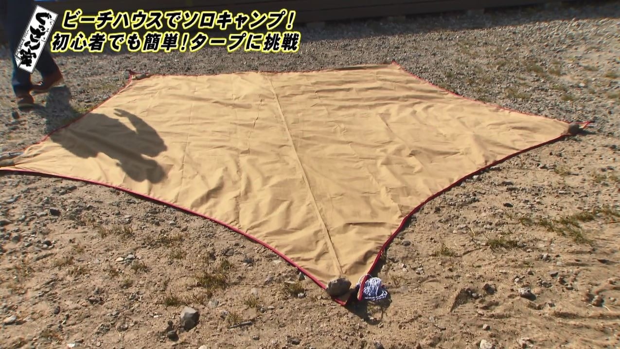 まずはソロキャンプのベースづくりから。取り出したのはタープ『ムササビウィング13ft.TC”焚き火”バージョン』(1万8480円)。ビーチハウスの目の前で五角形のタープを広げ、先端に付いているロープをペグ(杭)で地面に固定。すべてのペグを固定しポールを立てたら、倒れないようにロープを引っ張って調整します。