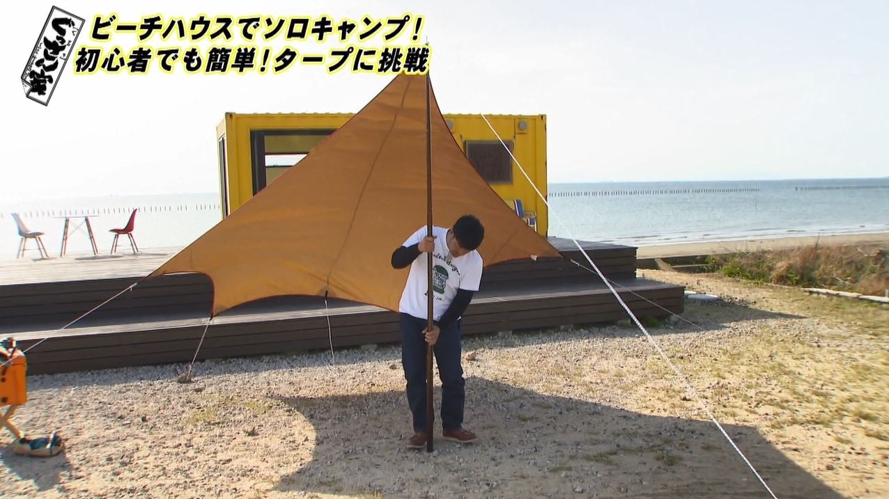 晴れ渡る晴天のもと、愛知・知多半島にある『ぐっさん家』の別邸『ザ・グッドサン・ビーチハウス』からスタート。近年、世代を問わず楽しめるキャンプ人口は年々増加。中でもいま、1人で大自然を満喫する“ソロキャンプ”が注目されているという話を聞いたぐっさん。「実は僕もすごく興味があって。世間のイメージではみんな『キャンプといえばぐっさんでしょ?』と思われているんですけど…でも僕テント張って寝た事がないんです」と意外にもキャンプ初体験を告白!