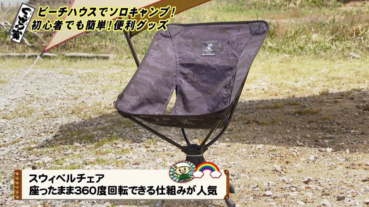 次に登場したのは『スウィベルチェア』と呼ばれるイス。棒状のパーツをカチャン、カチャンとドッキングさせ、シートをかぶせれば完成!「これは椅子の進化ですよ。軽いしコンパクトで…凄いですよコレ!」と感心するぐっさん。実はこのイス、なんと座ったまま360度回転!ソロキャンプを快適に過ごせる優れものです。