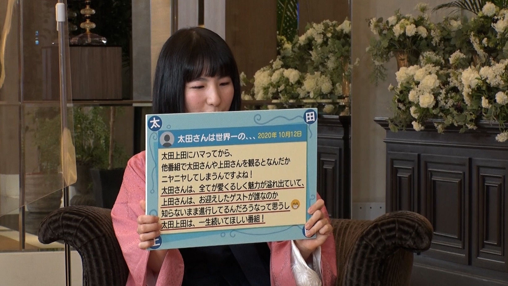 自らを『太田上田』の広報担当だと称する木本さん。ツイッターで発見した、『太田上田』へのつぶやきをフリップを使って紹介します。