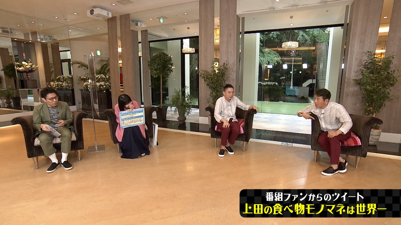 上田の食べ物モノマネVTR集を見た出演者たち。