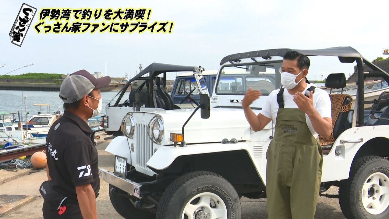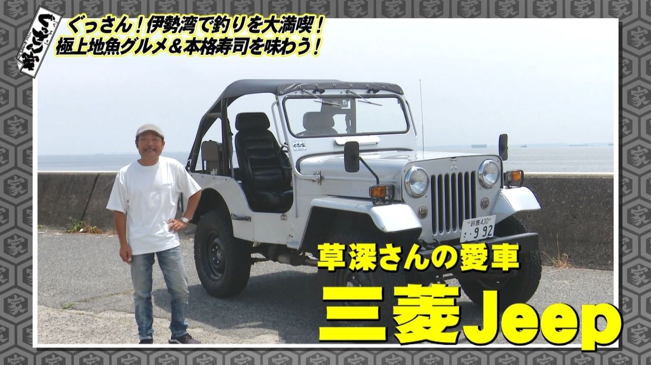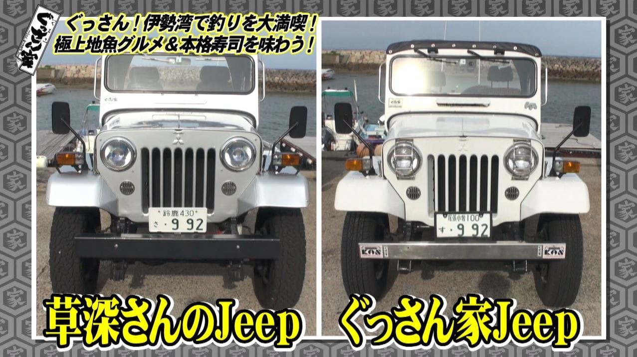 釣りの後は食事タイム!草深さん行きつけの寿司居酒屋へ向かい釣り上げた魚も一緒にいただきます。とその前に…「ちょっとJeep見せていただいてもいいですか?」と草深さんの愛車を見に行きます。4年ほど前に、ぐっさんと同じタイプのJeepを購入した草深さん。なんと車のナンバーまで一緒!番組の大ファンというだけあって“ぐっさん家愛”が止まりません!
