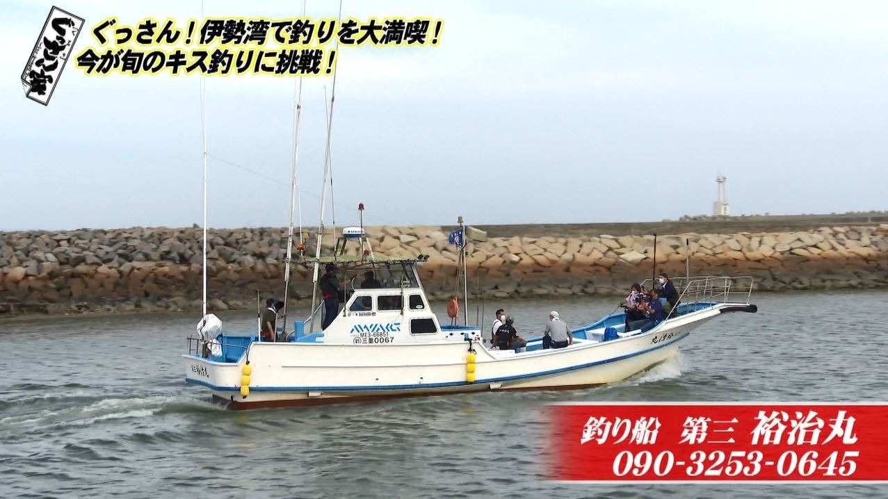 「立派な船!かっこいい!久々の釣りロケやね」とぐっさん。鈴鹿漁港から10分ほどのポイントに到着し3人で釣り糸を垂れます。