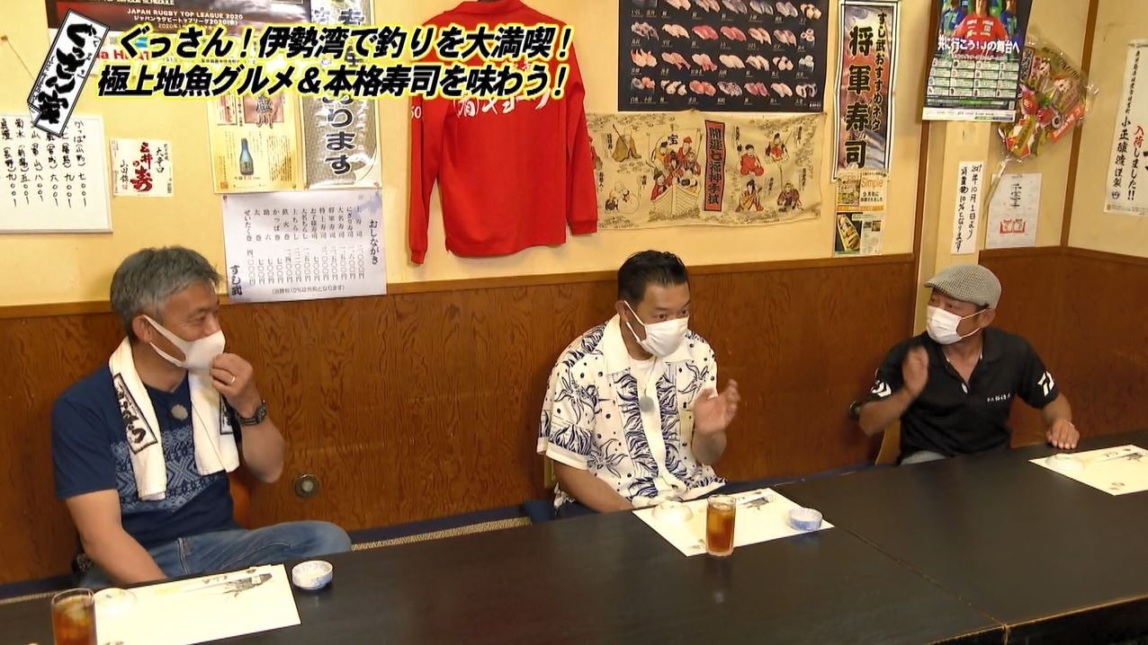 「うまい!これ。しっかりと歯ごたえがあって。おいしい!肝のコクと甘味があって」と大満足のぐっさん。美味しい地魚づくしの料理に3人の話も弾みます。