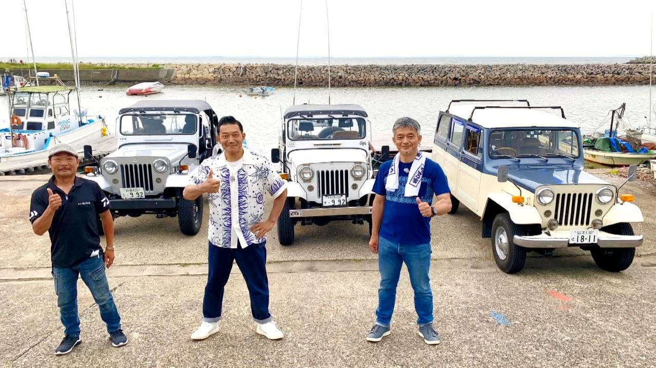 ぐっさん、草深さん、そしてお兄さんもJeep!3台のJeepで連なり、お店までドライブ♪「草深さんええわ。めっちゃ似合うてますわ」とぐっさんも嬉しそう。