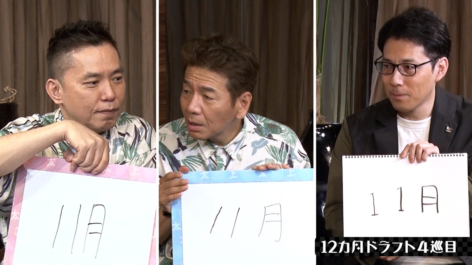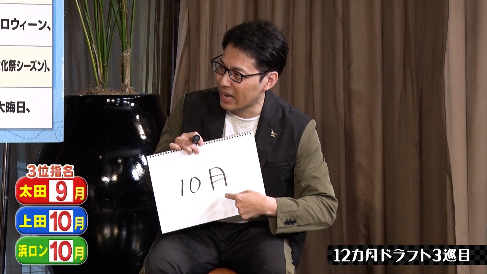 いよいよ3巡目に入った12ヶ月ドラフト。3人は一斉にボードを見せ、またしても浜ロンと上田が同じ10月を選択します。