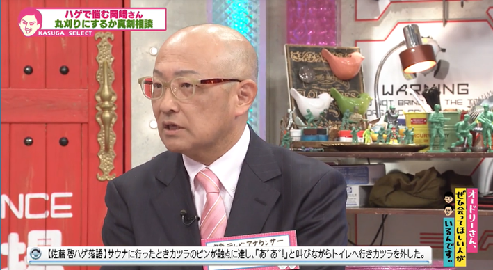 1996年の元日の朝、全国で放送される番組の中継でスキンヘッドへの転向を公表した佐藤アナ。カツラが嫌だということが言えなかったため、『新年今年は心機一転こうしました』という形の理由をつけ、公表したのだと話します。