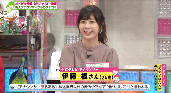 『オドぜひ』恒例の「女性アナウンサー大集合SP」!新人アナウンサーの爆弾発言で、スタジオがザワつく事態になったこの回。「この機会に先輩方にいろいろ質問したいのですが、よろしいでしょうか? 伊藤楓 (24歳 中京テレビ)」というクチコミと共に登場した新人の伊藤楓アナ。