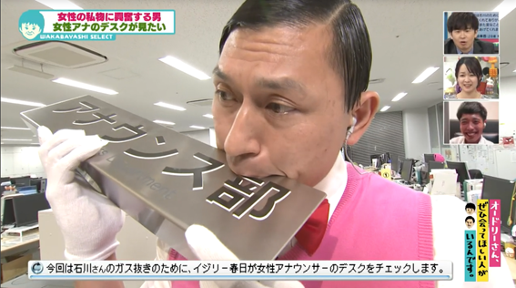 「女性アナのデスクを見たい」と登場したのは『オドぜひ』でお馴染みの変態ぜひらー・石川輝さん。そこで春日がアナウンス部に潜入し、中京テレビアナウンサーの実態を調査することに。磯貝初奈アナをはじめとする3人の女性アナの誰のデスクかがわからない状態で調査し、石川さんに分析をしてもらいます。