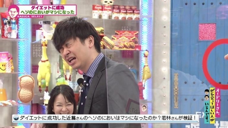 近藤さんは右手の人差し指をおへそにツッコみ、ぐりぐりと入念ににおいを付けて準備を進めます。意を決した若林、ニオイを嗅いでみると...数秒後、顔をゆがめ「変わってねぇじゃねぇか、お前!」と絶叫!検証の結果、「においが来るまでの時間が遠くなっただけ」でした。