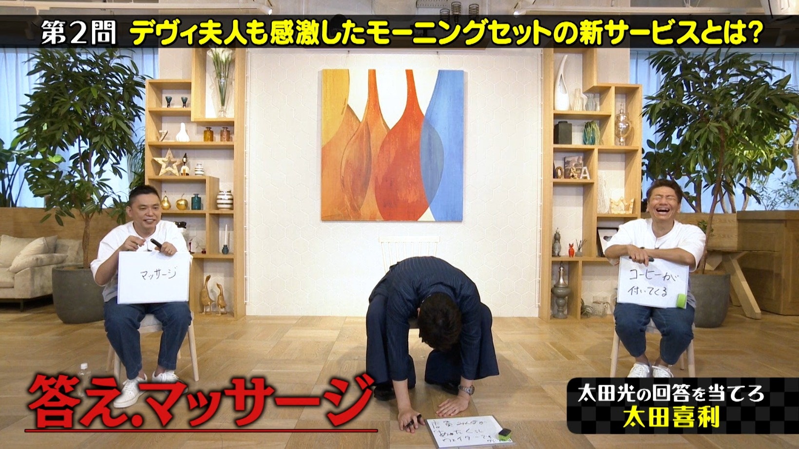 上田と古坂大魔王が回答し、次はいよいよ太田の番。太田はフリップを表に向けると、「マッサージ」と回答。