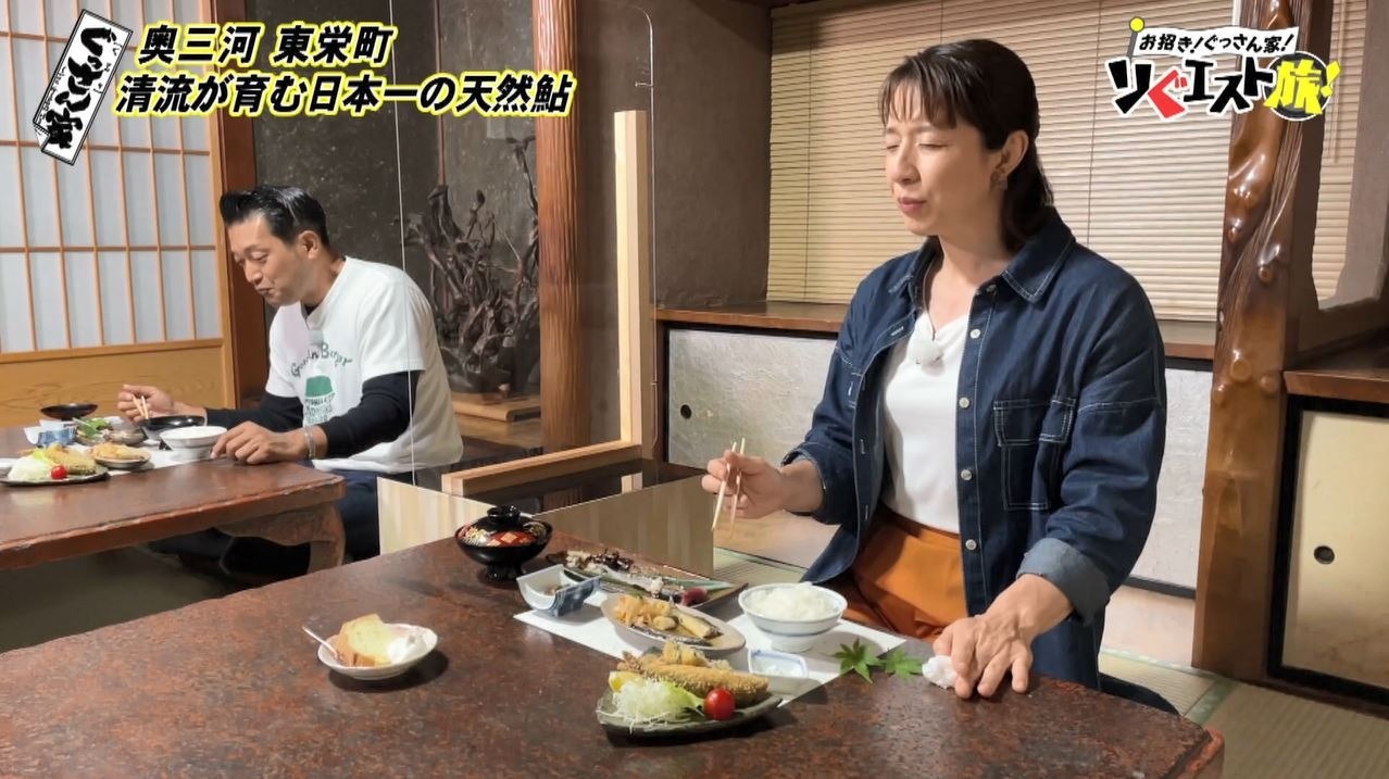 続いてやってきたのは愛知県東栄町。『ぐっさん家』では初めて訪れる場所、ということで依頼者を訪ねる前に、地元の料理旅館『大崎屋』にお邪魔し、東栄町の名物・鮎料理をいただきます。