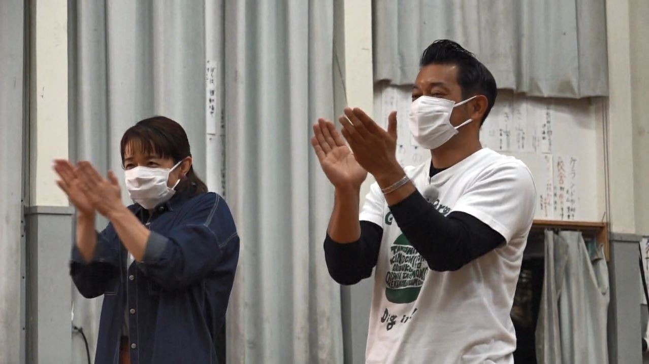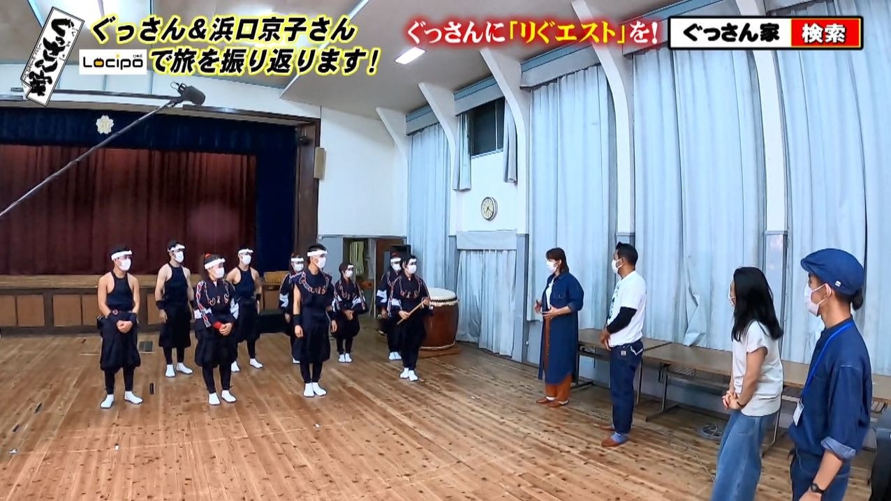 息の揃った迫力の演奏に聴き入るぐっさんと浜口さん。太鼓を持ったまま踊るような演舞もあり、どんどん和太鼓の魅力に引き込まれます。