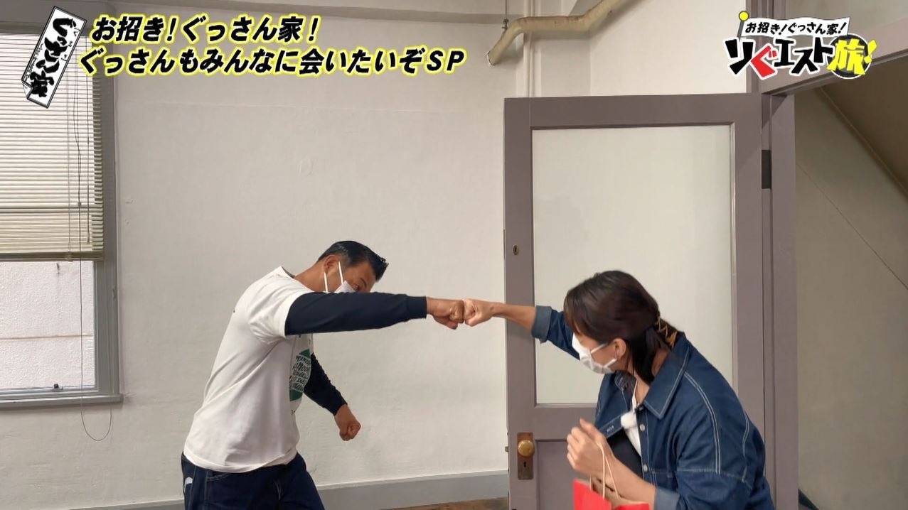 現れたのは元レスリング日本代表でオリンピックメダリストの浜口京子さん!ぐっさんとはプライベートでも仲良しだそうで、ぐっさんも一転笑顔に!グータッチでお出迎えします。