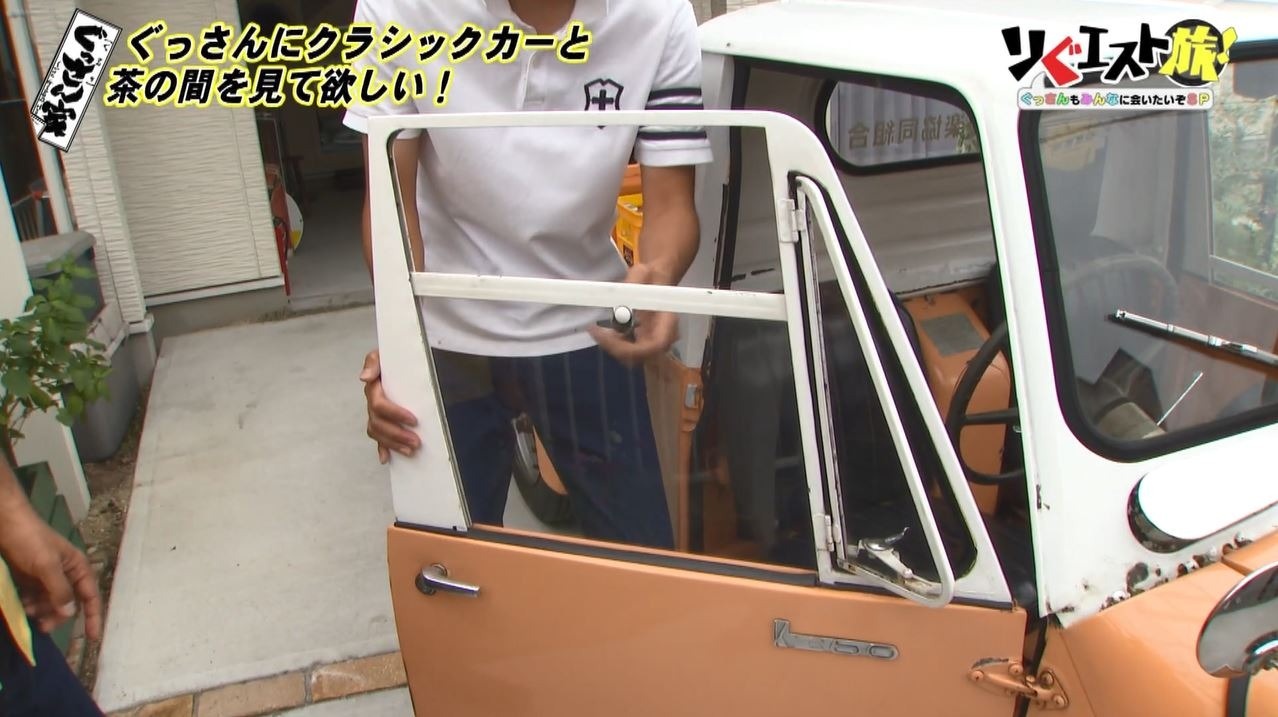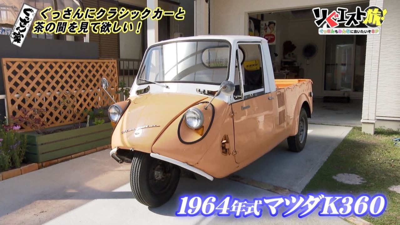 するとガレージからレトロな3輪の軽トラックが登場!「すごいの出てきた!」と興奮するぐっさん。